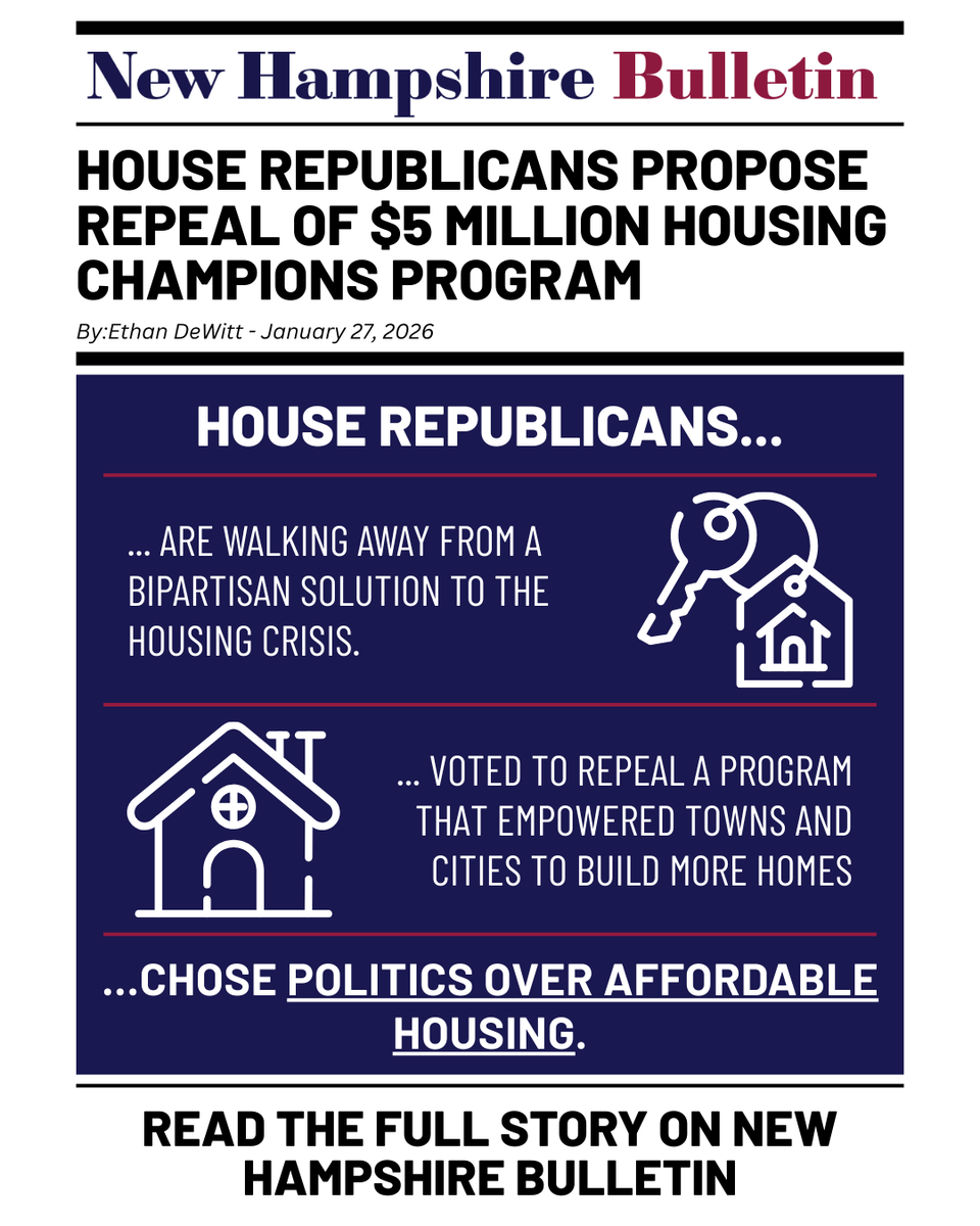 Housing Champions gives municipalities options to make housing for Granite Staters more affordable ... and NH House Republicans want to repeal it. Read more at the NH Bulletin website. #NHPolitics