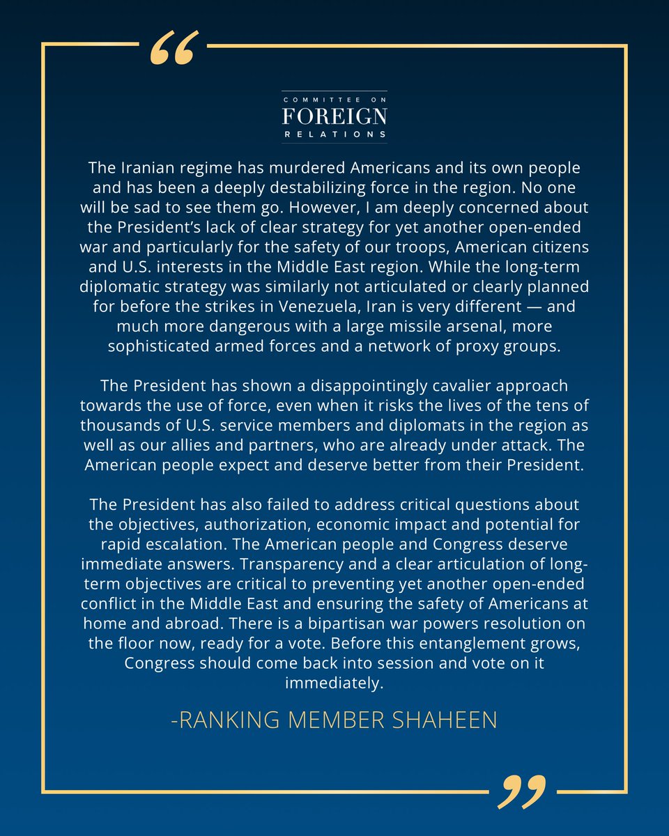 🔗 @SenatorShaheen’s full statement: https://www.foreign.senate.gov/press/dem/release/ranking-member-shaheen-statement-onpresident-trumps-attackon-iran
