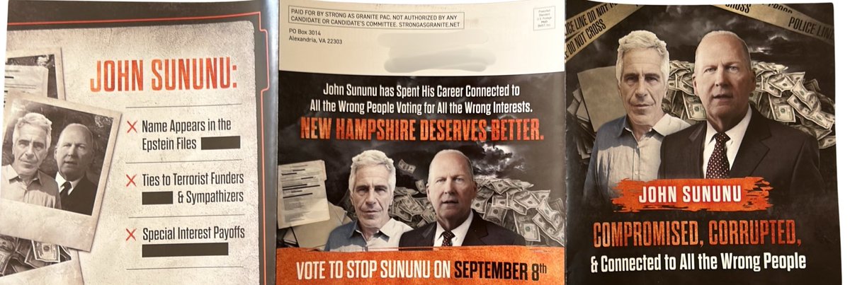 Strong as Granite PAC, a super PAC backing former Sen. Scott Brown (R-MA) in #NHSEN, is out with mailers that try to tie former Sen. John E. Sununu (R-NH) to Jeffrey Epstein
